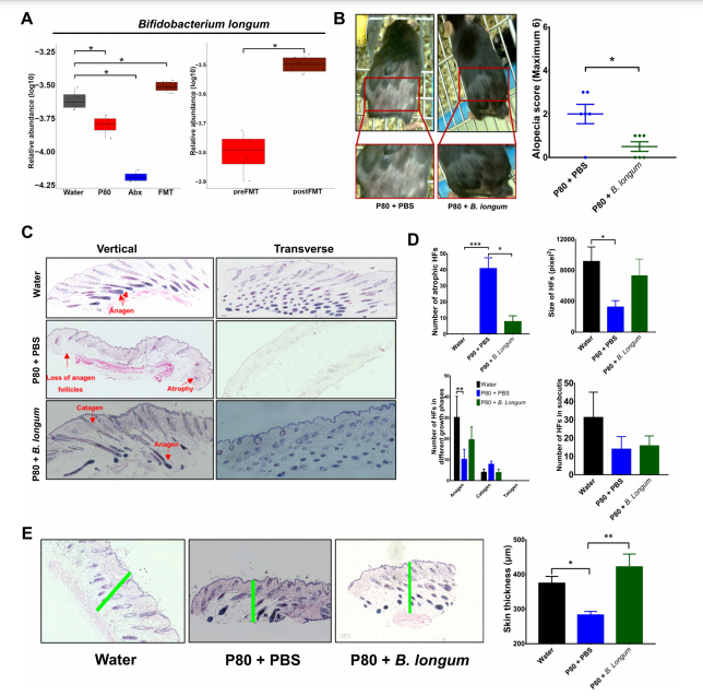 在这篇letter中,研究人员通过在无大豆饲喂的小鼠饮食中加入乳化剂聚山梨酯80(P80),成功诱导出了小鼠脱毛模型,通过对小鼠肠道菌群的检测,研究人员发现,这种脱毛小鼠肠道菌群出现失调现象,Akk菌增加、长双歧杆菌减少。为了改变肠道菌群情况,研究人员选择用抗生素/粪菌移植两种方法分别处理。结果发现,抗生素组的小鼠肠道菌群失调加重,脱发同样加剧,而抑制了健康小鼠粪便的脱毛小鼠,则出现了逆转情况,肠道菌群恢复稳态,脱毛情况也有显著改善。